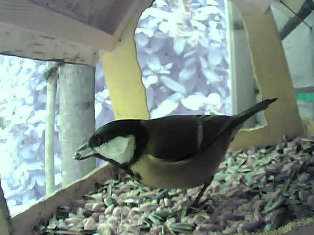 Schon im Dezember 2014 hatten wir die Kohlmeisen in unserem Futterhaus zu Besuch. Hier ein paar Fotos in Farbe, denn bei Tageslicht werden Farbfotos von unserer Beobachtungskamera erstellt.